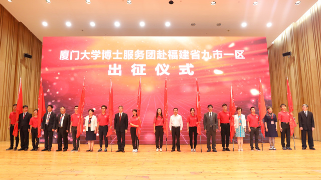 会上还举行了厦门大学博士生地方经济发展服务团赴福建省九市一区实践团出征仪式,各地市领导为博士团代表授旗。据悉,为贯彻落实中央组织部、团中央号召,聚焦新福建建设需要,我校选派13支博士服务团分赴全省九市一区地市开展专题实践调研。