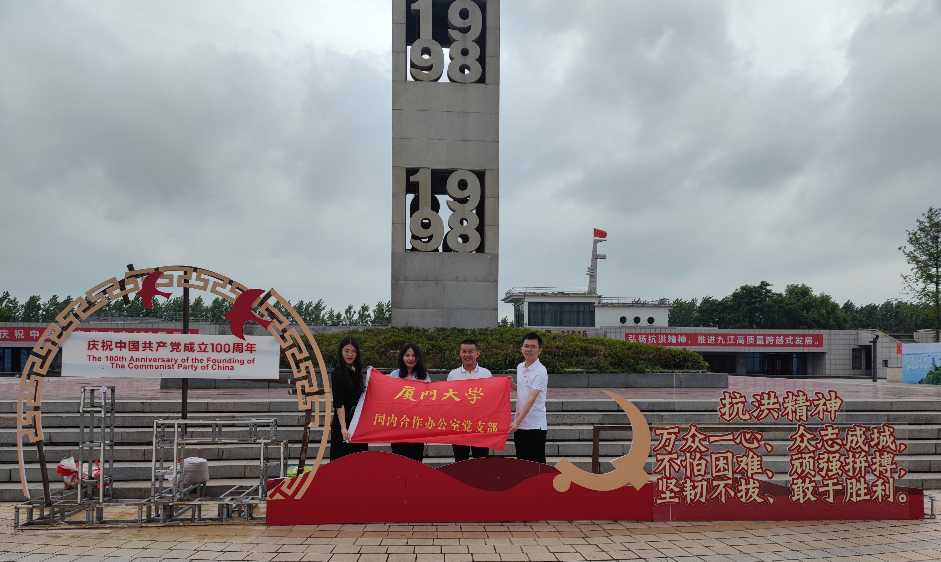 为深入贯彻落实习近平总书记“七一”重要讲话精神,推动党史学习教育走深走实,2021年7月26日-27日,国内合作办公室党支部全体党员前往江西九江市开展“重温入党誓词,践行初心使命”为主题的“固定党日+”活动。活动期间,支部党员同志们前往厦门大学九江研究院实地调研,参观98抗洪广场、共青垦殖场旧址,瞻仰耀邦陵园,在寻访红色足迹中感悟初心使命。