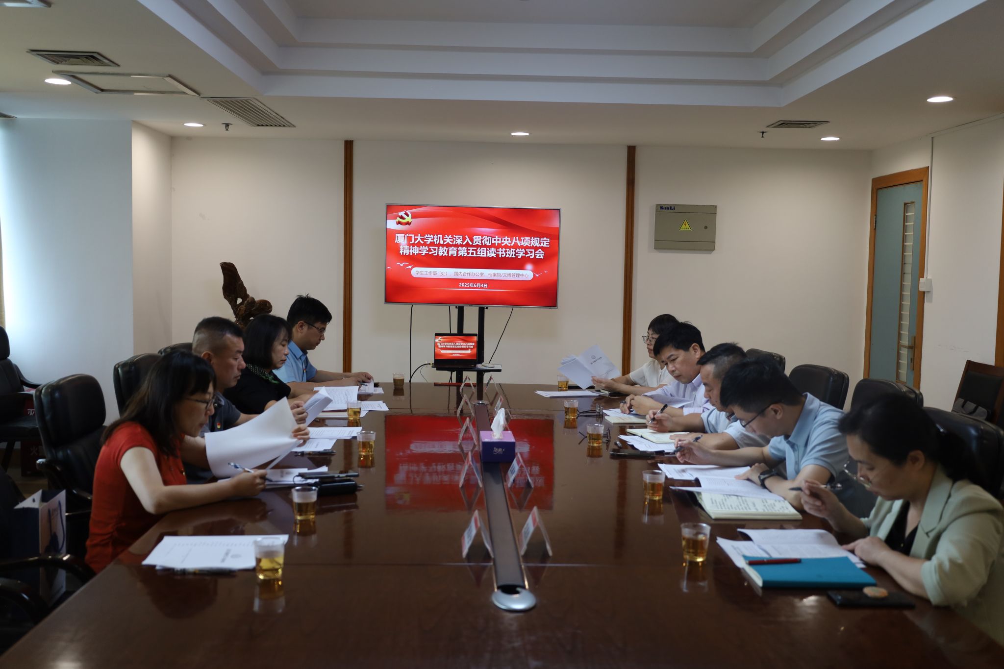 6月4日上午,机关深入贯彻中央八项规定精神学习教育第五组读书班学习会在颂恩楼1606会议室举行。学生工作部(处)、国内合作办公室、档案馆/文博管理中心党员领导干部参加会议。会议由国内合作办公室主任林奋强主持。