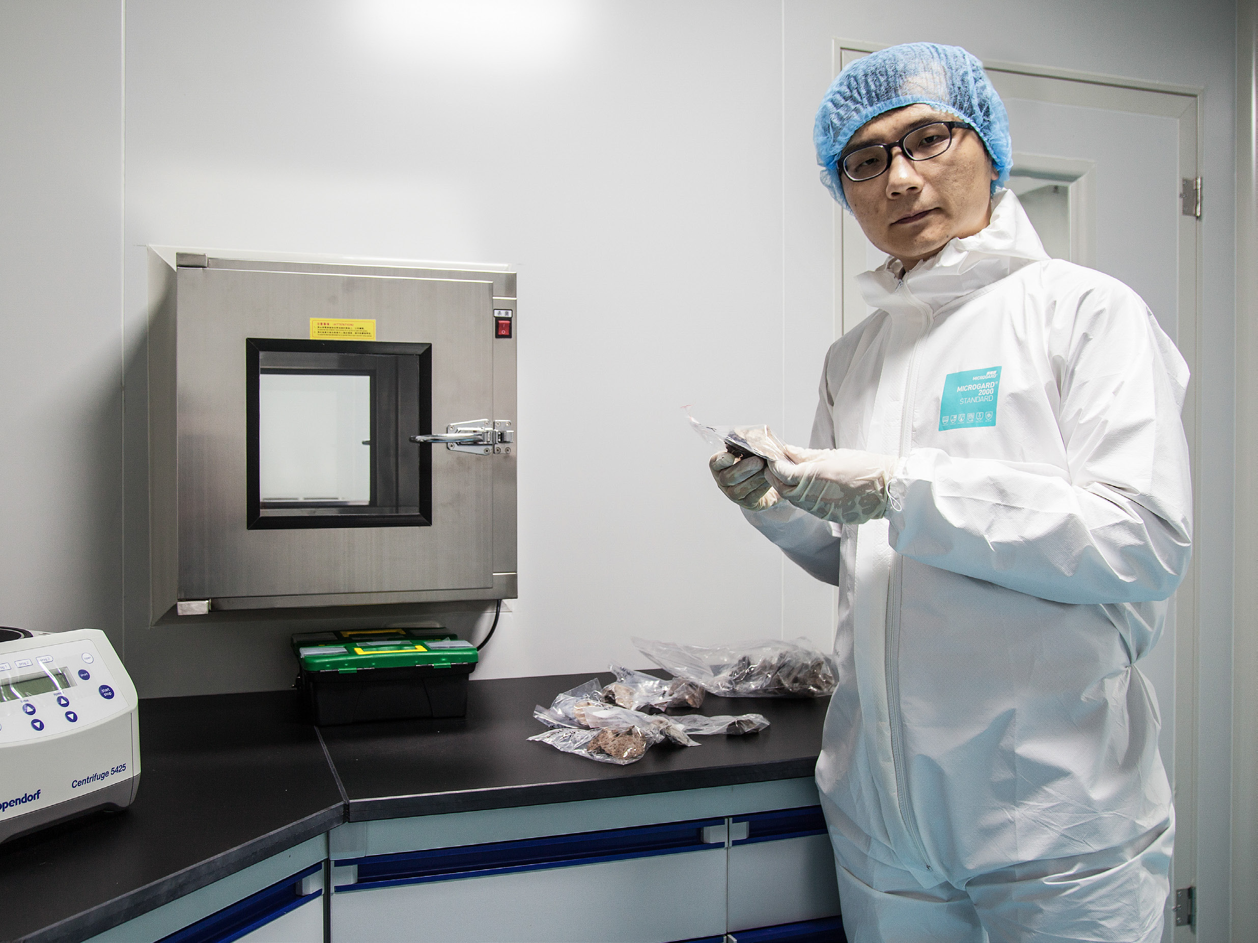 王传超在厦门大学专用于古人类DNA研究的超净实验室,手中的骨头取自西安幸福林带,是唐朝初期墓葬中古人的颞骨。