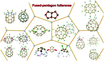 谢素原和团队提出“张力释放”和“局域芳香性”两个原理,以此突破“独立五元环规则”的制约,通过笼外衍生法稳定了占全世界合成总数三分之一以上的含相邻五元环的富勒烯。一系列新型富勒烯由此诞生。