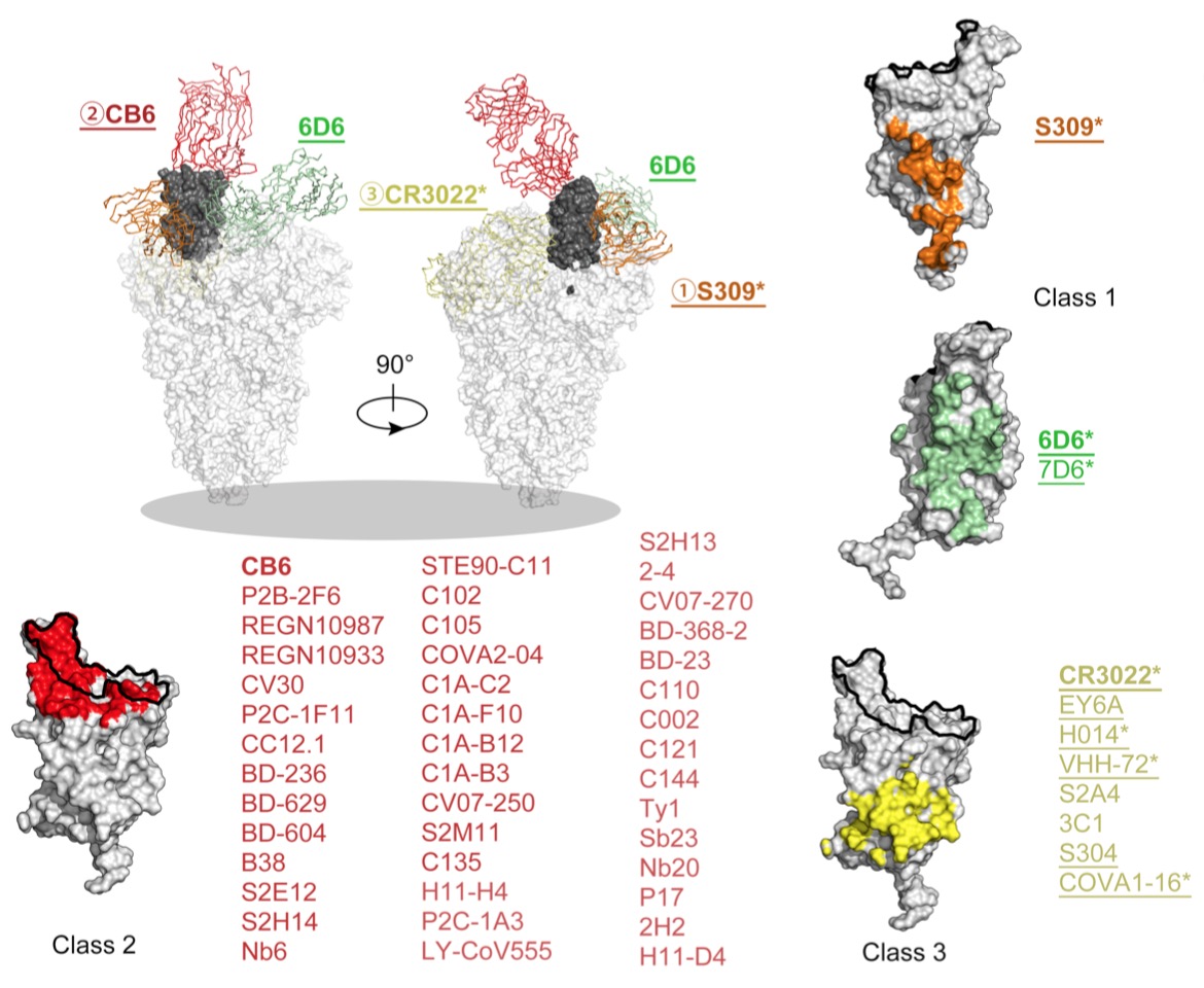 新冠病毒RBD的主要三类表位区和6D6/7D6抗体识别的靶点(绿色区)