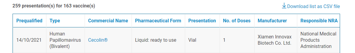 2021年10月14日,世界卫生组织(WHO)官网公布,由厦门大学和养生堂万泰生物旗下厦门万泰沧海生物技术有限公司联合研制的首个国产宫颈癌疫苗(馨可宁®,Cecolin®)正式通过世界卫生组织PQ认证。这是中国第一支通过世界卫生组织PQ认证的宫颈癌疫苗,也是第一支由发展中国家拥有完全自主知识产权而获得国际认可的宫颈癌疫苗!