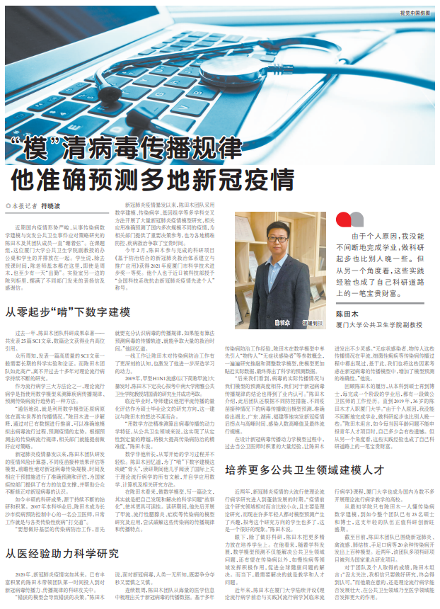眼下,除了做好科研,陈田木把更多精力放在培养学生上。在他看来,随着学科发展,数学模型预测不仅能解决公共卫生领域问题,还有望在传染病以外,如慢性病等领域发挥积极作用,促进全球健康问题的解决。而当下,最需要解决的就是教学和人才问题。