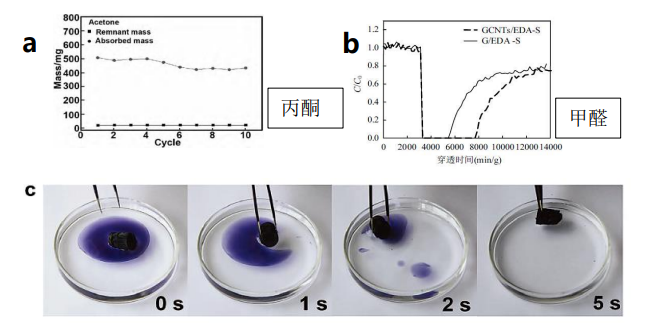 石墨烯气凝胶可以吸附很多物质,比如甲醛、丙酮和染料等有机污染物(图4),这在净化室内空气和处理环境污染等方面应用广阔。此外,它还能够吸收水、油污等,抑制霉菌生长,可以替代传统的硅胶等干燥剂,用于鞋、袜、服装的防潮和防霉变,同时可吸附织物在加工过程中产生的甲醛等有毒气体,消除异味。与传统的干燥剂相比,吸附能力更强(吸附量可达自身重量的几百倍),功能范围更广,一物多用,具有广适性、易处理、成本低、吸附剂来源广泛等优点。