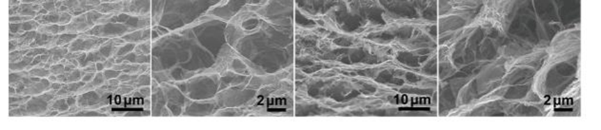 图2可以看出石墨烯气凝胶内部的多孔结构,这种结构使其密度低、比表面积大(可高达2630m2/g,约半个足球场的面积),可使其很好地应用于催化和吸附领域。