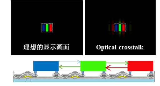 在Micro-LED显示屏中,微米尺寸的Micro-LED芯片一颗一颗紧密地排列成阵列,每颗Micro-LED芯片作为显示屏的一个自发光像素单元。然而,Micro-LED芯片发出的光会在外延层中以光波导的形式横向传播,最终有一部分光会从芯片侧面出射,并横向传播而照射到邻近的芯片。该横向光传播所造成的光串扰(Optical-crosstalk),已经成为困扰Micro-LED显示的技术难题之一。