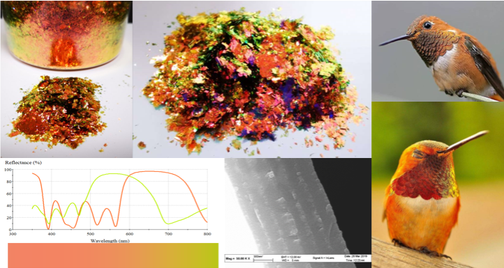 自然界中昆虫甲壳、蝴蝶翅膀、鸟类羽毛和鱼类的鳞片的靓丽色彩是由纳米尺度的微观结构通过光的干涉、衍射、散射等途径,对入射光线的特定波长产生不同程度的反射、吸收、透射产生的颜色,这种艳丽的色彩被称作为结构色。研究生物的结构颜色,揭示颜色产生的物理机理及光子调控策略,为光子器件结构设计和制备提供了有价值的思路。结构色新材料是材料领域的重要发展方向,其规模化制造更是目前的行业难点。